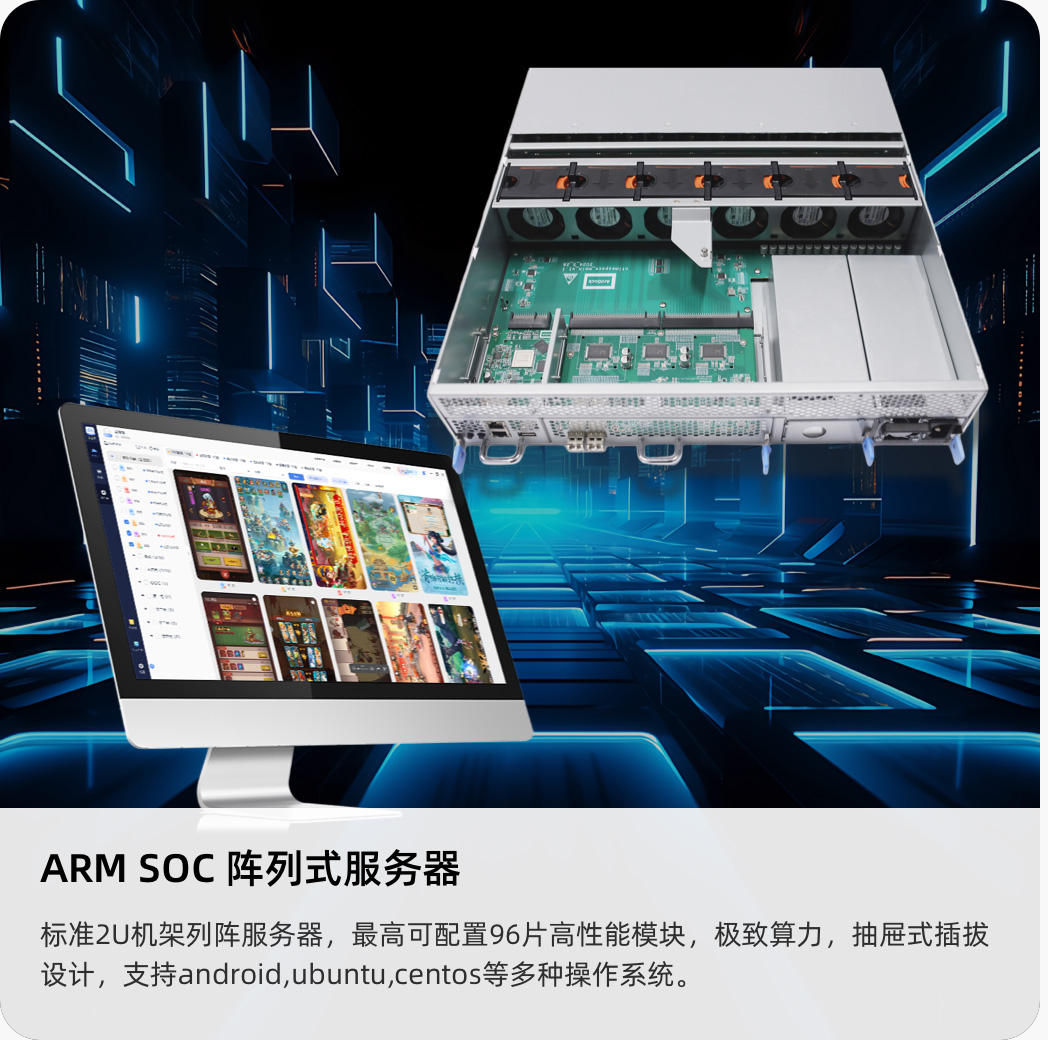 ? ? ? ? ? ?標(biāo)準(zhǔn)2U機(jī)架列陣服務(wù)器,最高可配置96片高性能模塊,極致算力,抽屜式插拔設(shè)計(jì),支持安卓android、unbuntu、centos等多種操作系統(tǒng)。